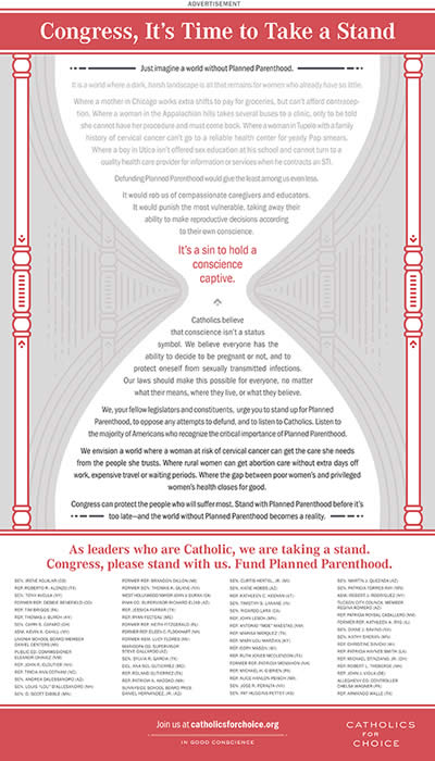 Today, over 60 Catholic state leaders and legislators from 25 states banded together in a full-page back-cover ad in the Washington Post urging Congress to preserve federal funding for Planned Parenthood. The statement draws on Catholic social justice and tells representatives in Congress that defunding Planned Parenthood would give the least among us even less.